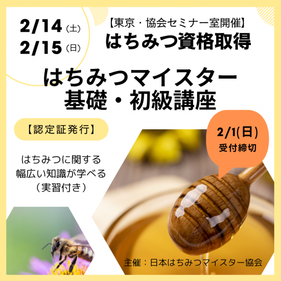 はちみつ資格取得講座「はちみつマイスター基礎・初級講座(東京)」2026年2月開催のご案内です。