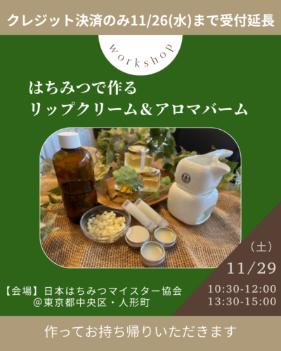 11月29日(土)に開催する「はちみつで作るリップクリームとアロマバーム」。