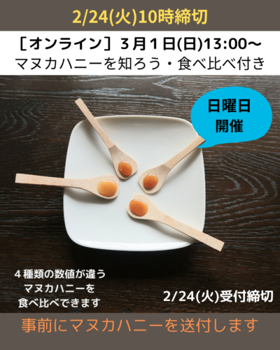 • 2/24(火)10時受付締切【オンライン】3月1日(日)13:00~マヌカハニーを知ろう・食べ比べ付き