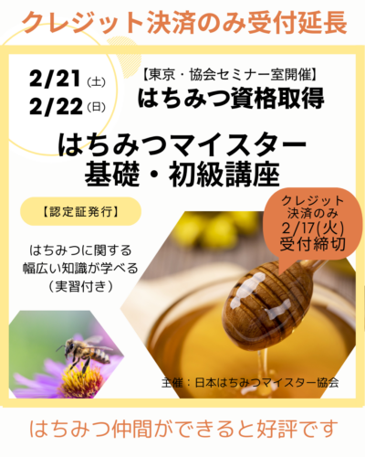2月開催のはちみつ資格取得講座(2/21-22開催)は、クレジット決済のみ【2月17日(火)23時まで】受付延長しました!